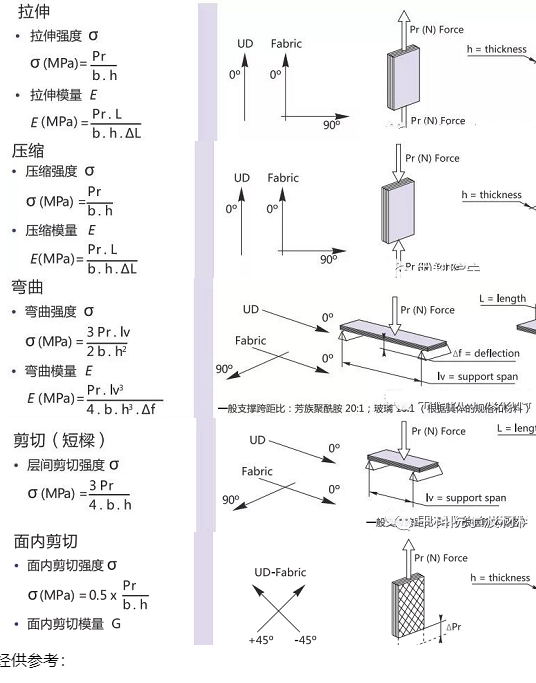 在碳纖維復(fù)合材料拉伸、壓縮、彎曲等試驗(yàn)中,復(fù)合材料強(qiáng)度、模量主要計(jì)算公式如下所示。