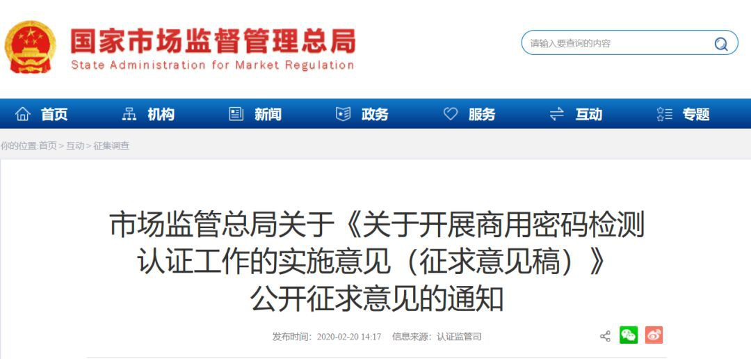 據(jù)該通知,為推進(jìn)商用密碼檢測認(rèn)證體系建設(shè),促進(jìn)商用密碼產(chǎn)業(yè)健康有序發(fā)展,根據(jù)《中華人民共和國產(chǎn)品質(zhì)量法》《中華人民共和國密碼法》和《中華人民共和國認(rèn)證認(rèn)可條例》,市場監(jiān)管總局、國家密碼管理局聯(lián)合起草了《關(guān)于開展商用密碼檢測認(rèn)證工作的實施意見(征求意見稿)》,現(xiàn)正向社會公開征求意見。各有關(guān)單位或個人提出修改意見,可于2020年3月6日前反饋市場監(jiān)管總局。