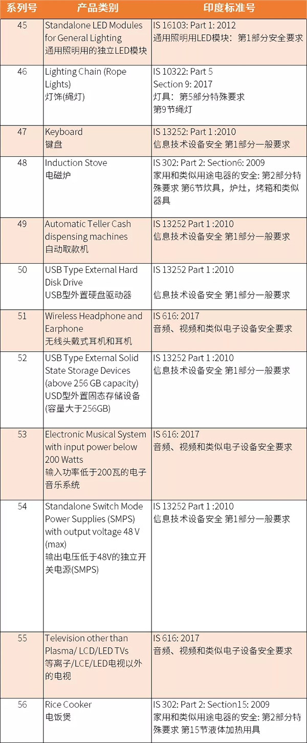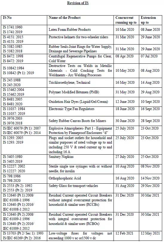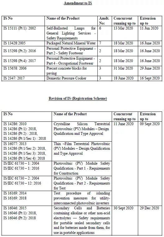 另外,印度中央標(biāo)準局于2020年3月27日發(fā)布通知,由于受疫情影響, 將推后原本將于2020年3月1日及之后強制執(zhí)行的新版IS標(biāo)準,由原定執(zhí)行日期起推遲90天,詳情如下: