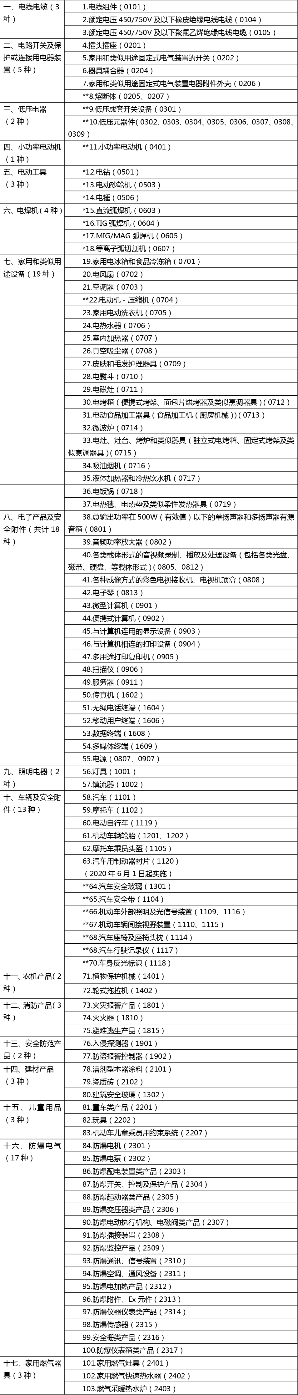 注:*所標(biāo)記產(chǎn)品為實(shí)施自我聲明程序A(自選實(shí)驗(yàn)室型式試驗(yàn)+自我聲明)的產(chǎn)品(7種),