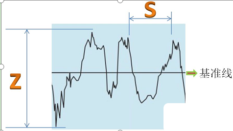 我們一般評價粗糙度會有基準線,基準線以上最高點我們叫波峰點,基準線以下最低點叫波谷點,那么波峰和波谷之間的高度我們用Z來表示,加工產品的微觀紋理的間距我們用S來表示。
