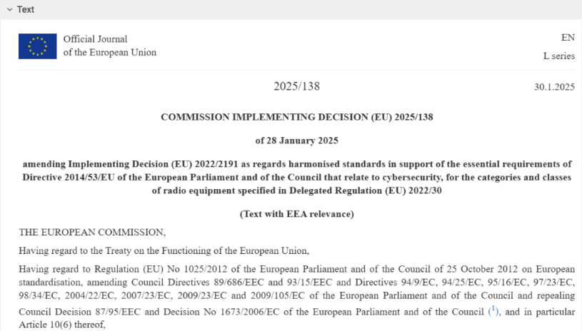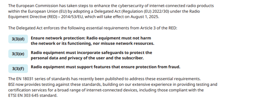2025年1月30日,歐盟委員會(huì)正式將EN 18031標(biāo)準(zhǔn)列入《歐盟官方公報(bào)》(OJ)的《無(wú)線電設(shè)備指令》(RED)協(xié)調(diào)標(biāo)準(zhǔn)清單。該法案將于2025年8月1日正式實(shí)施,屆時(shí)無(wú)線電設(shè)備必須符合RED指令第3(3)條(d)、(e)和(f)點(diǎn)的網(wǎng)絡(luò)信息安全要求才能進(jìn)入歐盟市場(chǎng)銷售。