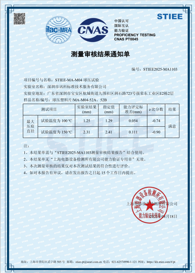 我司STIEE-MA-M04 球壓試驗(yàn)?zāi)芰︱?yàn)證圓滿(mǎn)通過(guò),我們秉承科學(xué)嚴(yán)謹(jǐn)?shù)墓ぷ鲬B(tài)度,以客戶(hù)為中心,高效統(tǒng)籌安排測(cè)試計(jì)劃,竭力縮短測(cè)試時(shí)間的周期,為客戶(hù)提供快捷、公正的第三方咨詢(xún)檢測(cè)等服務(wù)。服務(wù)區(qū)域遍布廣東廣州、深圳、東莞、佛山、中山、珠海、清遠(yuǎn)、惠州、茂名、揭陽(yáng)、梅州、江門(mén)、肇慶、汕頭、潮州、河源、韶關(guān)及全國(guó)各地如您有相關(guān)產(chǎn)品需要咨詢(xún),歡迎您直接來(lái)電咨詢(xún)我司工作人員,獲得詳細(xì)的費(fèi)用報(bào)價(jià)與周期方案等信息,深圳訊科期待您的光臨!