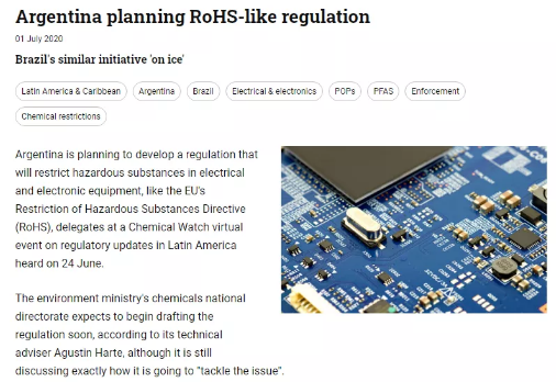 2020年6月24日,阿根廷宣布正在計(jì)劃制定一項(xiàng)限制電子電氣設(shè)備中有害物質(zhì)的法規(guī), 類(lèi)似于歐盟的RoHS。根據(jù)技術(shù)專(zhuān)家的意見(jiàn),當(dāng)局近期或?qū)㈤_(kāi)始起草此法規(guī)。