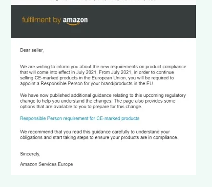 在這之前,產(chǎn)品只需做完CE認(rèn)證,就會(huì)覺得萬事大吉了。不過現(xiàn)在,歐盟已有新的規(guī)則出來了:對(duì)于銷售帶有 CE 標(biāo)志的商品,亞馬遜強(qiáng)調(diào),必須要在 2021 年 7 月 16 號(hào)之前,確保具有位于歐盟的負(fù)責(zé)人(簡(jiǎn)稱歐代)。