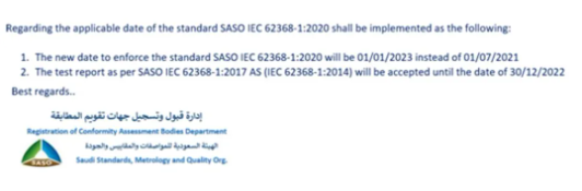 IEC 62368-1: 2018 (即SASO IEC 62368-1:2020) 的強制執(zhí)行日期延后至2023年1月1日 ,也就是自2023年1月1日起將不再接受IEC 62368-1:2014第二版的CB證書與報告,只接受IEC 62368-1:2018(第三版)的CB證書與報告 。