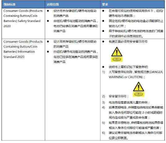 紐扣或硬幣電池可以在各種各樣的產(chǎn)品中找到,包括兒童玩具、照明產(chǎn)品、遙控器、手表等。電玩具一般使用的紐扣/硬幣電池為扁平的圓形單電池,厚度從1-11毫米不等,直徑可達32毫米。在玩耍電玩具時,兒童如果不慎吞食紐扣/硬幣電池后可導(dǎo)致窒息甚至死亡。2020年12月22日,澳大利亞政府正式生效4個強制標準來減少因使用紐扣/硬幣電池造成的傷亡風險。強制性標準包括18個月過渡期,從2022年6月22日開始,供應(yīng)商必須符合該標準要求。