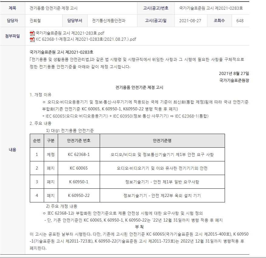 KATS于2021年8月27日正式公告開始實施KC 62368-1,官網(wǎng)鏈接及相關公告請見以下:
