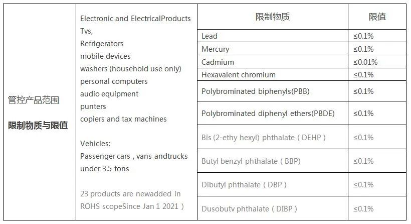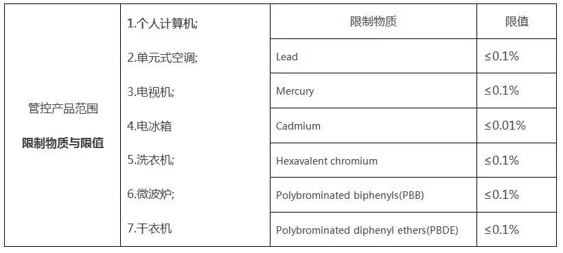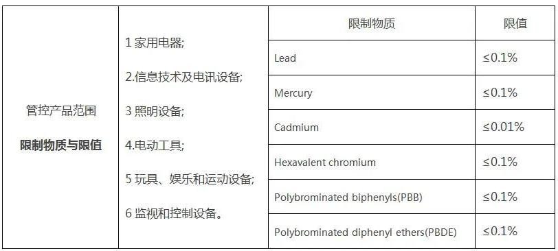 該標(biāo)準(zhǔn)的目的在于消除電子電器產(chǎn)品中的鉛、汞、鎘、六價(jià)鉻、多溴聯(lián)苯、多溴二苯醚以及四種鄰苯共10項(xiàng)物質(zhì)。