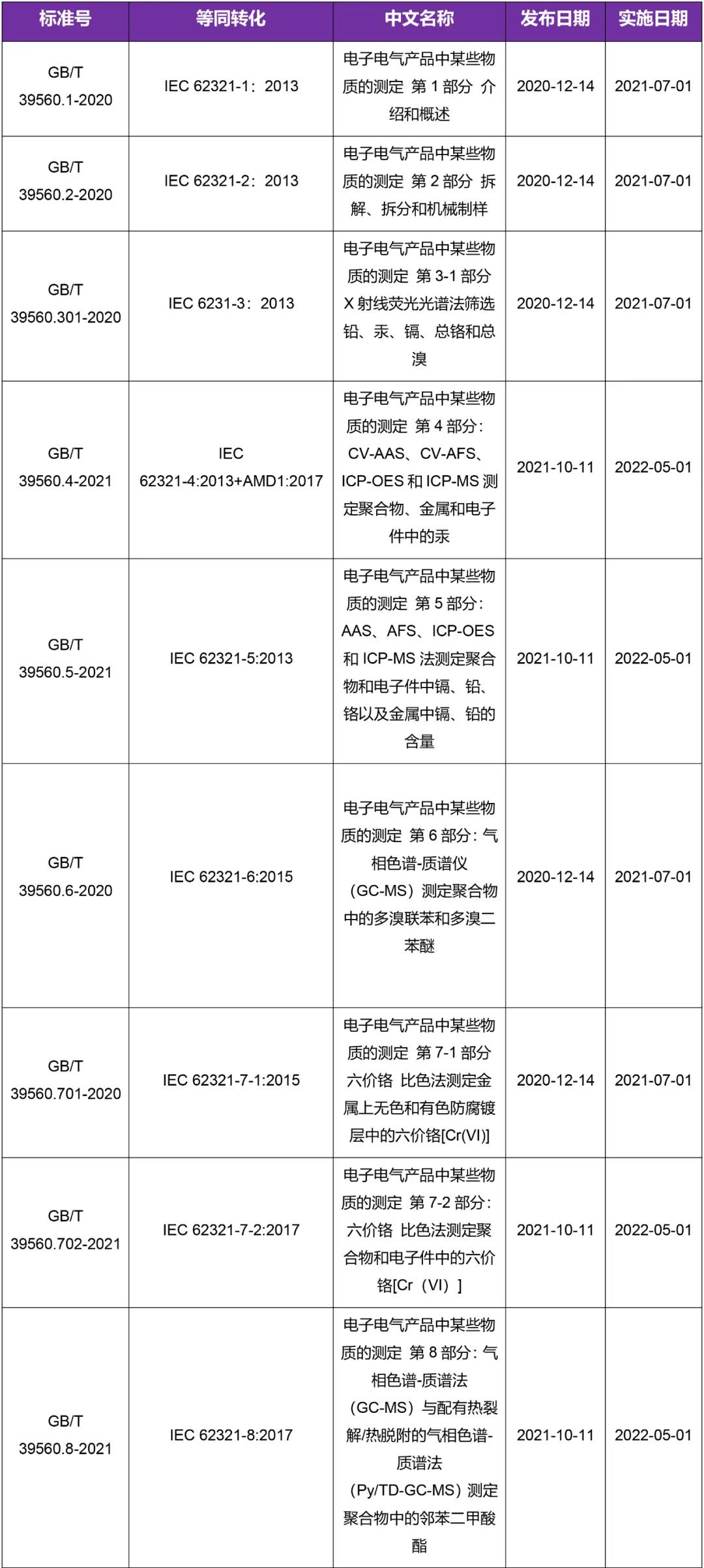 隨著電子電氣領(lǐng)域環(huán)保法規(guī)的加強(qiáng),更多有害物質(zhì)種類被限制使用,同時(shí)也出現(xiàn)更先進(jìn)快速的新型檢測技術(shù),而目前國內(nèi)電子電氣產(chǎn)品RoHS檢測標(biāo)準(zhǔn)GB/T 26125:2011是等同采用IEC62321:2008(此標(biāo)準(zhǔn)已經(jīng)按檢測技術(shù)和限制物質(zhì)種類修訂并發(fā)布了9個(gè)系列標(biāo)準(zhǔn))。因此,GB/T 39560系列標(biāo)準(zhǔn)應(yīng)運(yùn)而生,有望替代GB/T 26125成為我國《電器電子產(chǎn)品有害物質(zhì)使用管理辦法》配套使用標(biāo)準(zhǔn)!