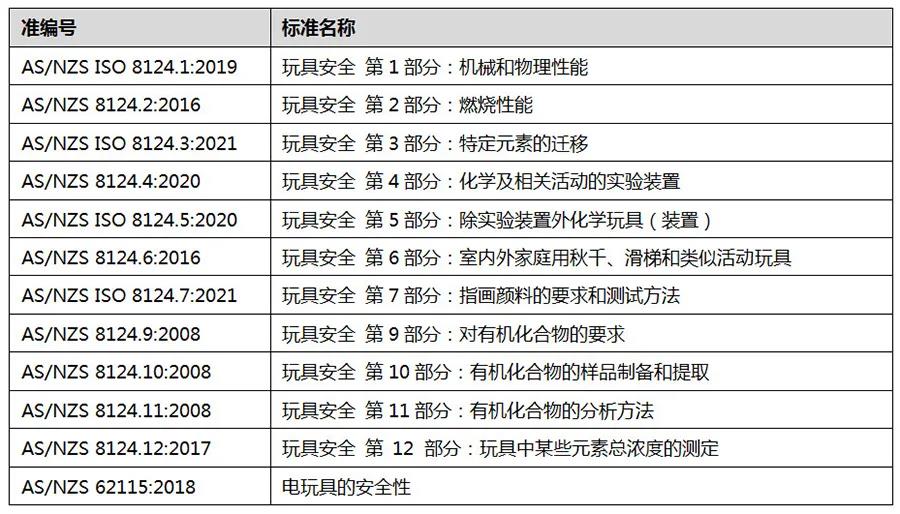 在玩具的自愿性標(biāo)準(zhǔn)方面,澳大利亞基本上采用國際標(biāo)準(zhǔn)ISO 8124系列標(biāo)準(zhǔn),歐盟EN71系類標(biāo)準(zhǔn)。主要標(biāo)準(zhǔn)如下表所示: