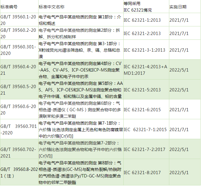 國家市場監(jiān)督管理總局(國家標準化管理委員會)分別于2020年12月14日和2021年10月11日分兩個批次批準并發(fā)布了電子電氣產(chǎn)品中某些物質(zhì)的測定GB/T 39560系列標準共計9個標準。針對XRF篩選測試、聚合物中多溴聯(lián)苯和多溴二苯醚以及鍍層中六價鉻的測試標準已于2021年7月1日正式實施,而對聚合物、金屬和電子件中的鉛、鎘、汞、鉻以及聚合物和電子件中六價鉻、聚合物中鄰苯二甲酸酯的測試標準將于2022年5月1日正式實施。